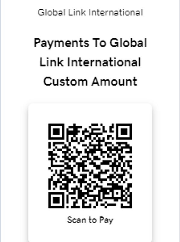 If you need to make a payment to Global Link International you can pay custom amounts using our Custom Pay Link below or by scanning the QR code above.